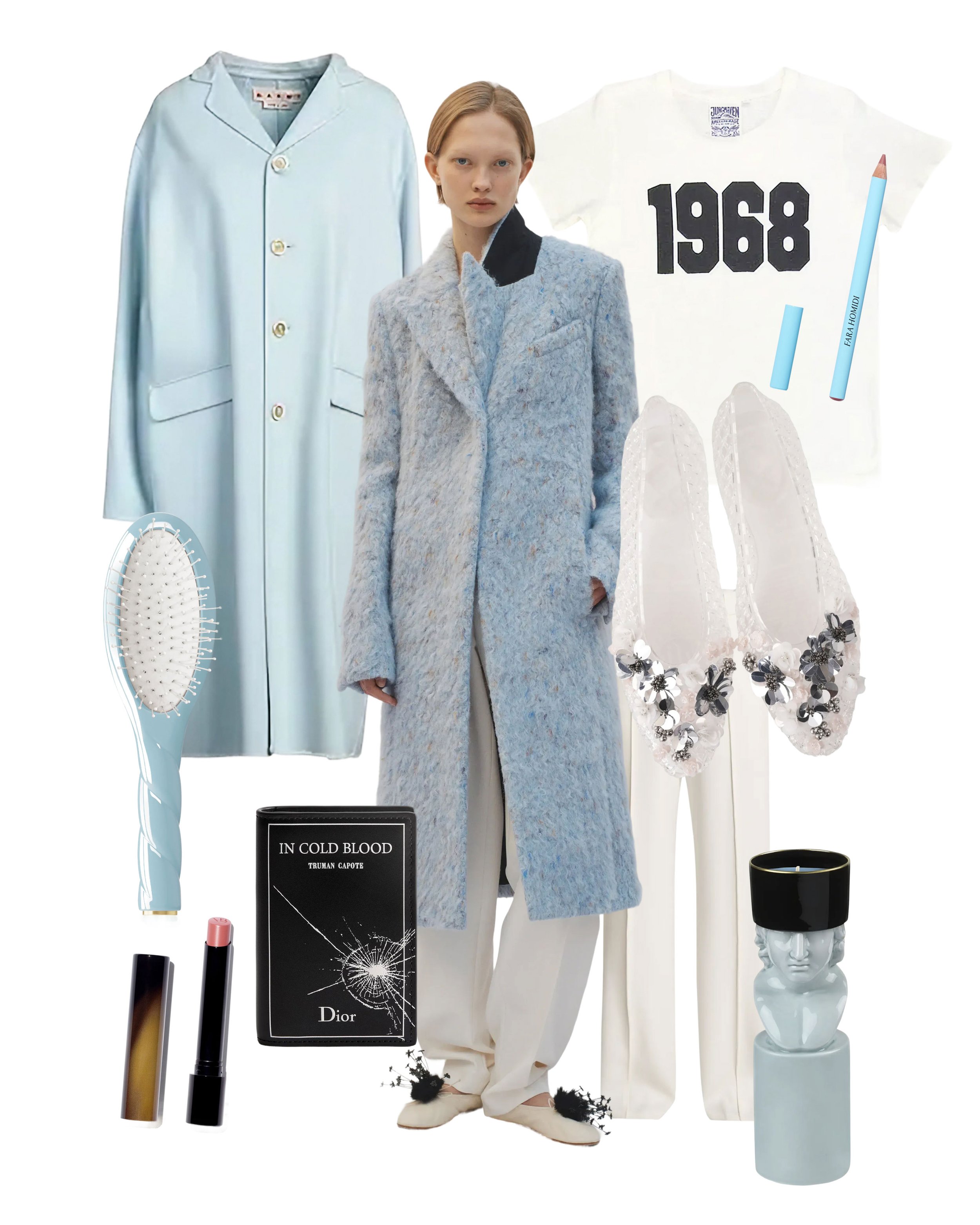 An ice-blue coat to match your disposition, a t-shirt in soft rebellion, a wallet devoted to your favorite true crime novel, a lacquered hairbrush, Cinderella’s glass slippers, ivory trousers bold enough to tempt fate, a restrained pink kiss, exacting lip liner, and a candle to light the way.