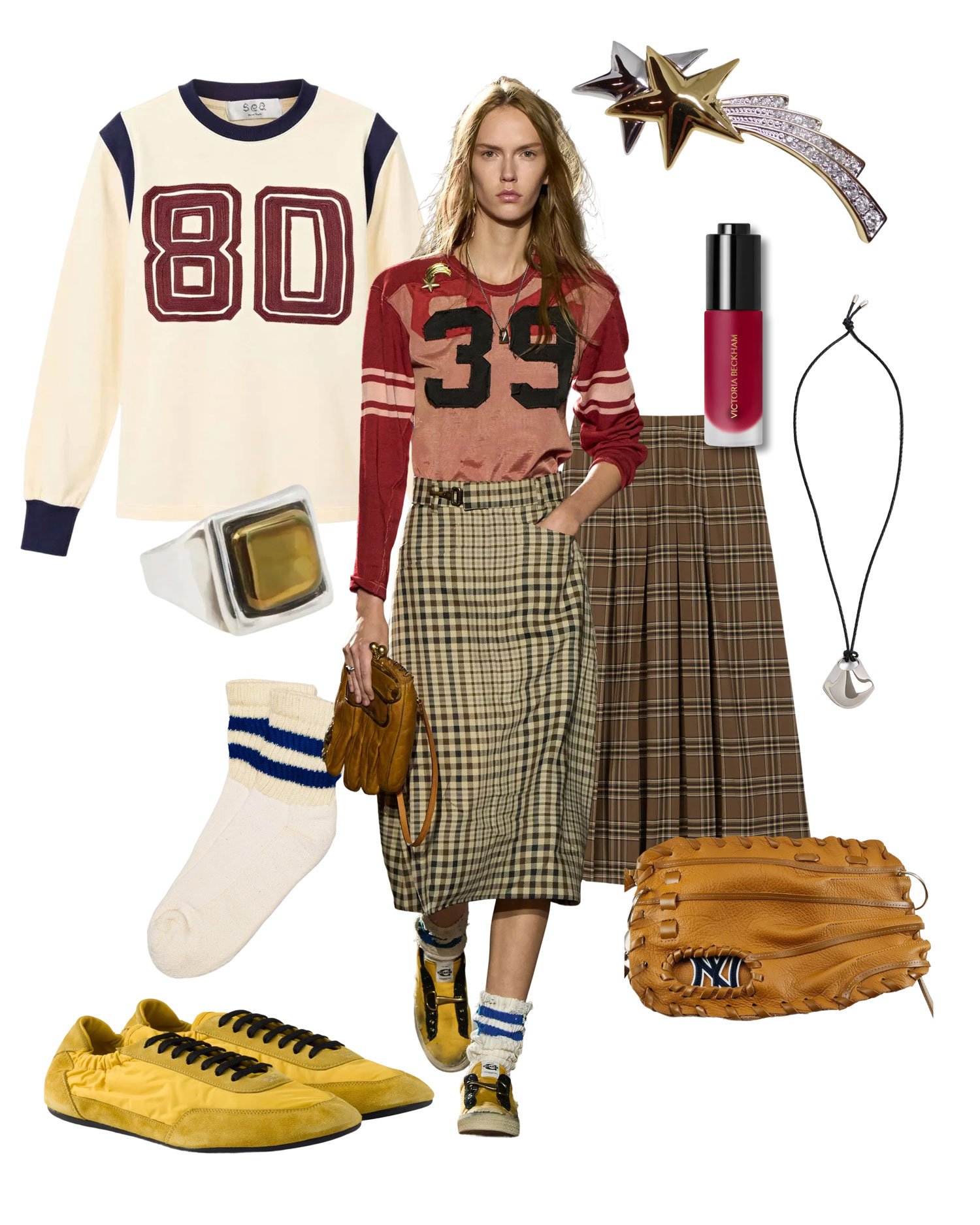 Your old jersey number from the glory days, a long plaid skirt for academic credibility, rugby socks, bright yellow trainers, a baseball glove-shaped bag, a lucky pendant necklace, a shooting star brooch, a class ring, and a watercolor flush.