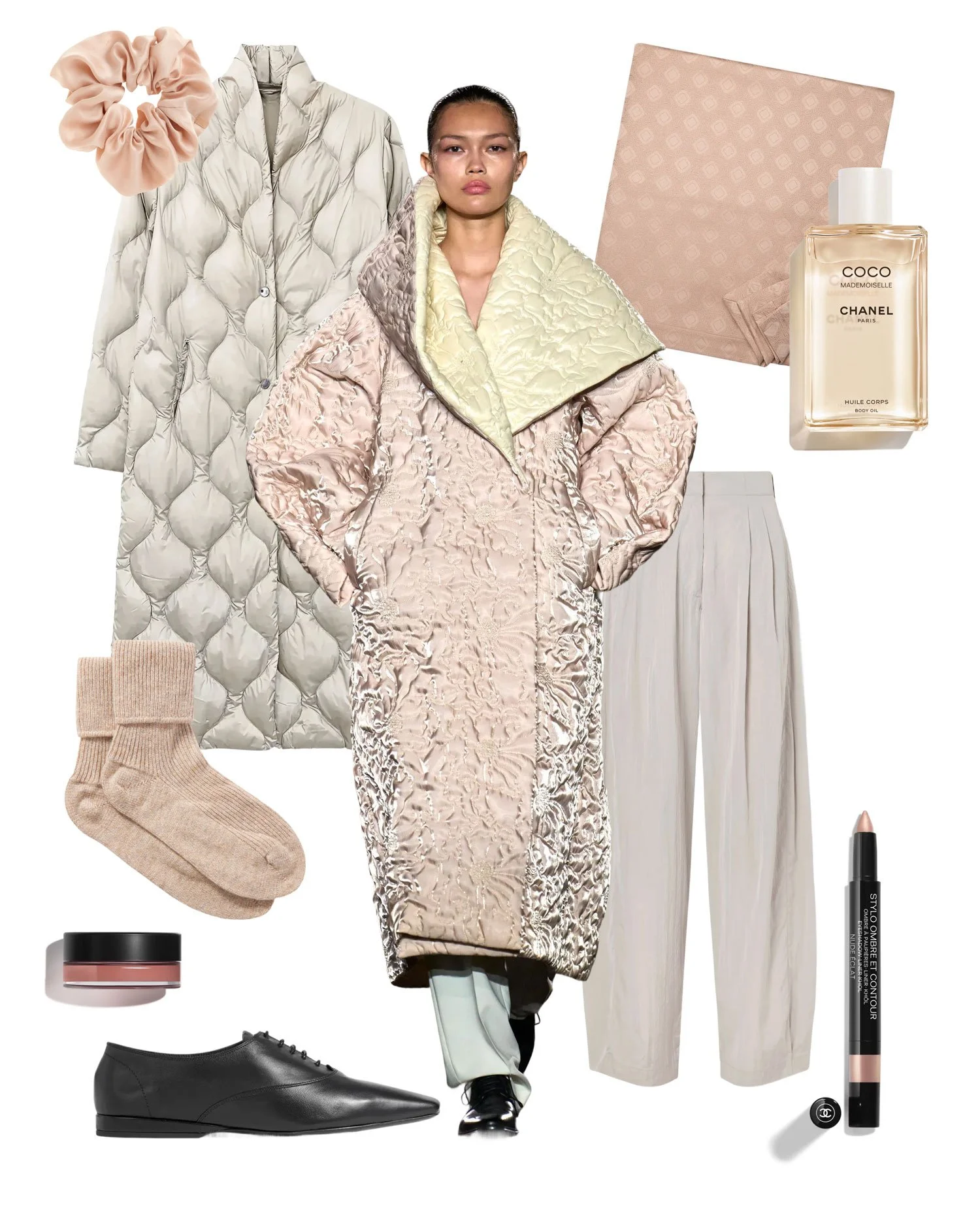A sculptural quilted coat, your bed linen as an extra layer, fluid tailored trousers, sleek lace-up oxfords, cashmere socks, a silk scrunchie, softly contoured cheeks, and a silky body oil with a fresh, rebellious edge.