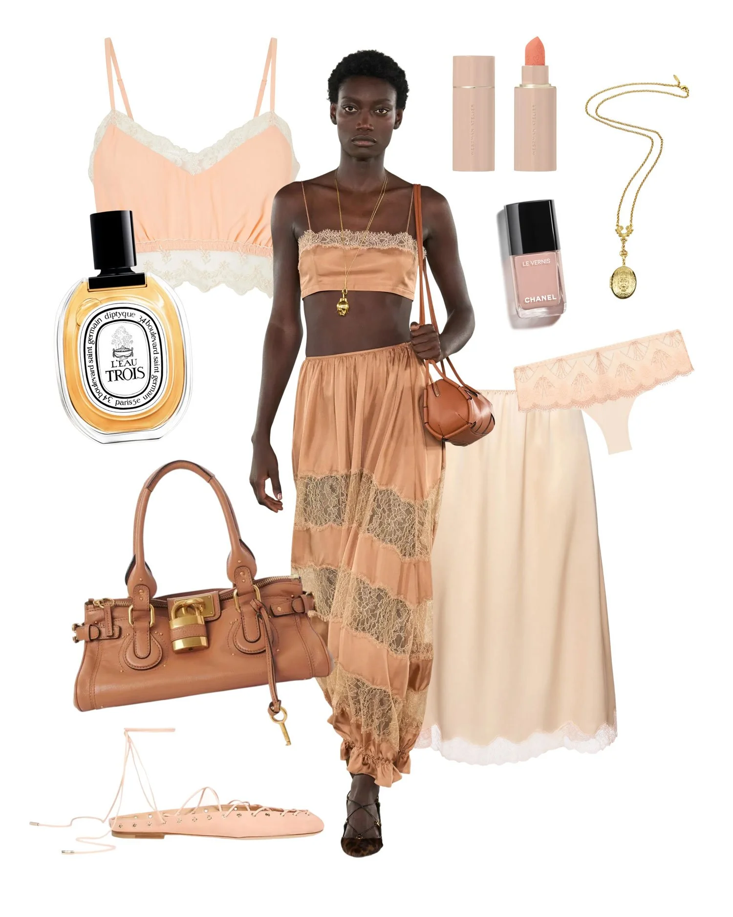 A matching lace top and skirt, coordinating underpinnings that make you feel put together, a delicate gold pendant, trendy lace-up flats, a heritage leather bag, an elegant French perfume, a peach-toned kiss, and a perfect manicure.