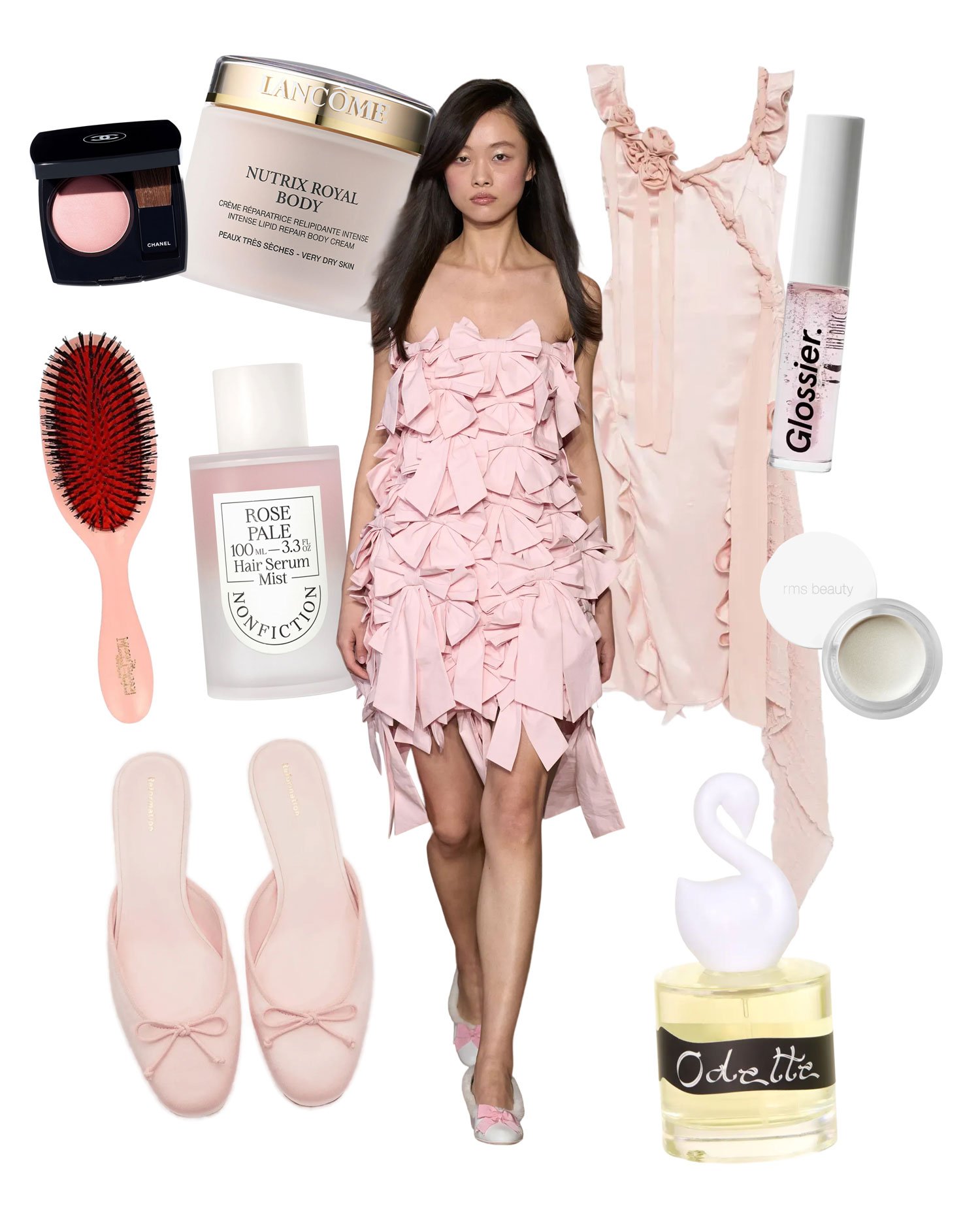 A blush rosette slip that moves like silk, ballet flats tied just so, glassy hair brushed to perfection, petal-pink cheeks, a sheer rose gloss, a glimmer in your eye, glowing skin, and a swan-soft floral fragrance that feels romantic but self-possessed.
